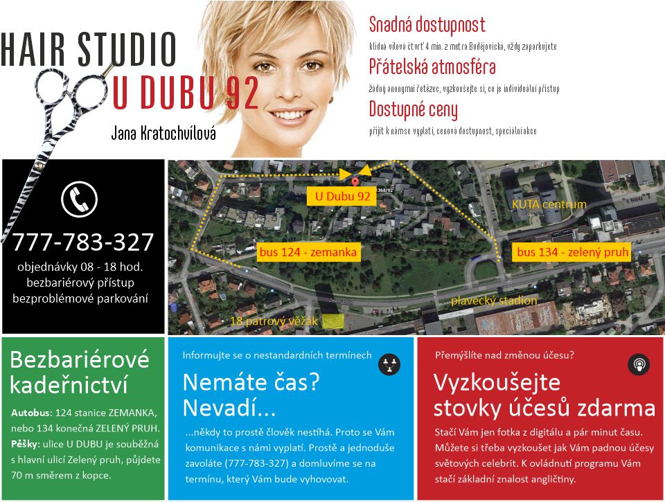 HAIR STUDIO U DUBU 92 - DÁMSKÉ, PÁNSKÉ A DĚTSKÉ KADEŘNICTVÍ V LONDÝNSKÉM STYLU. 14700 PRAHA 4, U DUBU 92, TELEFONICKÉ OBJEDNÁVKY 777-783-327. EMAIL:HAIR@UDUBU92.CZ PROVOZUJE DTP STUDIO S.R.O. U DUBU 92, 147 00 PRAHA, IČ 00548294, DIČ CZ00548294. WWW.DTPSTUDIO.CZ